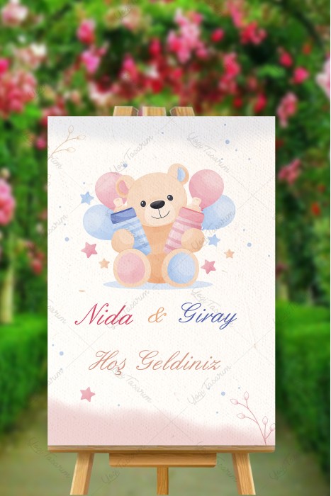 İsme Özel Balonlu Ayıcıklı Hoşgeldin Mavi Karşılama Panosu