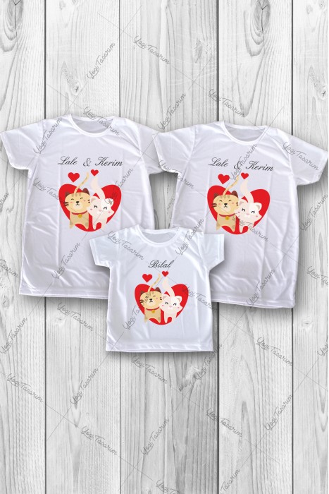 Çift İsimli Sevgili Kedi Silüet Temalı 3lü Aile Kombin Tişört Baskı