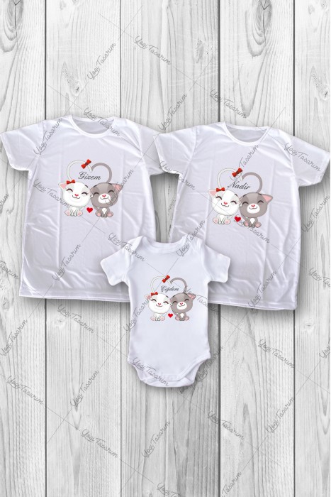 Sevgili Kediler Çift İsimli 3lü Aile Kombin Zıbın ve Tişört Baskı