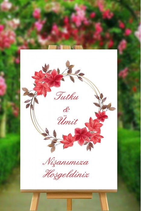 Kırmızı Kahve Yuvarlak Çiçek Temalı İsimli Nişan Karşılama Panosu Üzerindeki Değerlendirmeler
