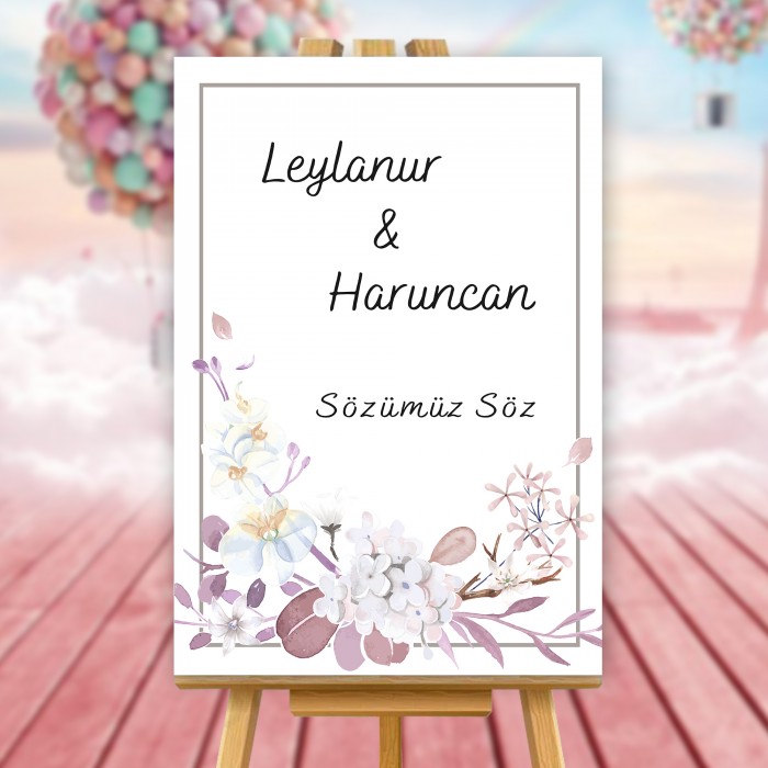 Pembeli Morlu Çiçekli Düğün Karşılama Panosu