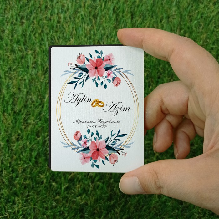 Pembe Çiçekli Düğün Hatırası Ahşap Magnet