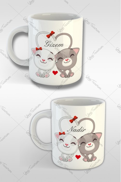 Sevgili Çift Kediler İsme Özel Kombin Kupa Bardak Baskı